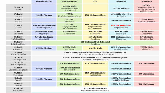 Gottesdienstplan Dezember bis Februar
